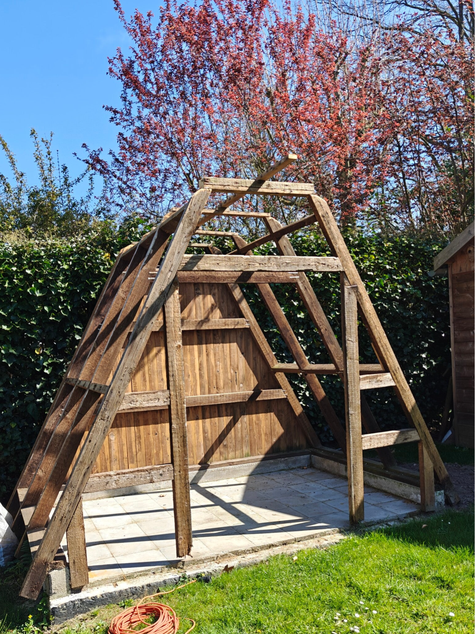 In het oorspronkelijke tuinhuisje bestond de voorwand hoofdzakelijk uit een deur met aansluitend een raam ernaast. Hierdoor was er een te brede opening om een deur te kunnen monteren. Er was een extra deurstijl nodig. Ik heb uiteraard dezelfde hoogte genomen als deze van de andere balken en een standaard deurbreedte van 90 cm als uitgangspunt. Deze deurstijl heb ik kunnen maken van een balk die vrijgekomen was bij de afbraak van de dakrand. Even de maten nemen, op lengte zagen, afschuren, behandelen en klaar om te monteren d.m.v. metalen plaatjes op de aangewezen afstand, zodat er later een deur van 90 cm kan geplaatst worden.